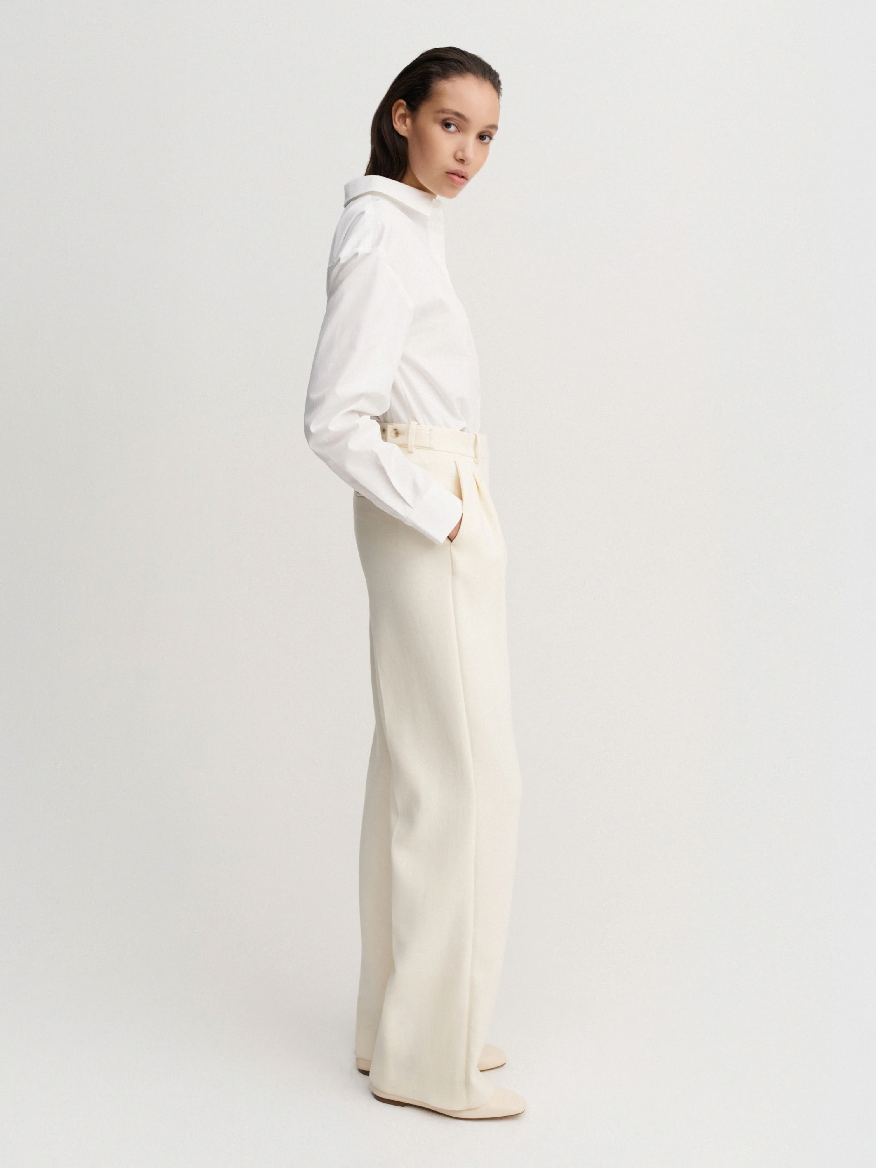 Amel Trousers are crafted from a refined woven blend with a smooth hand feel and elegant structure. Tailored to a high-waist, wide-leg silhouette with pressed front pleats that enhance the relaxed drape. Finished with adjustable side tabs that allow the trousers to be worn low or high on the waist.