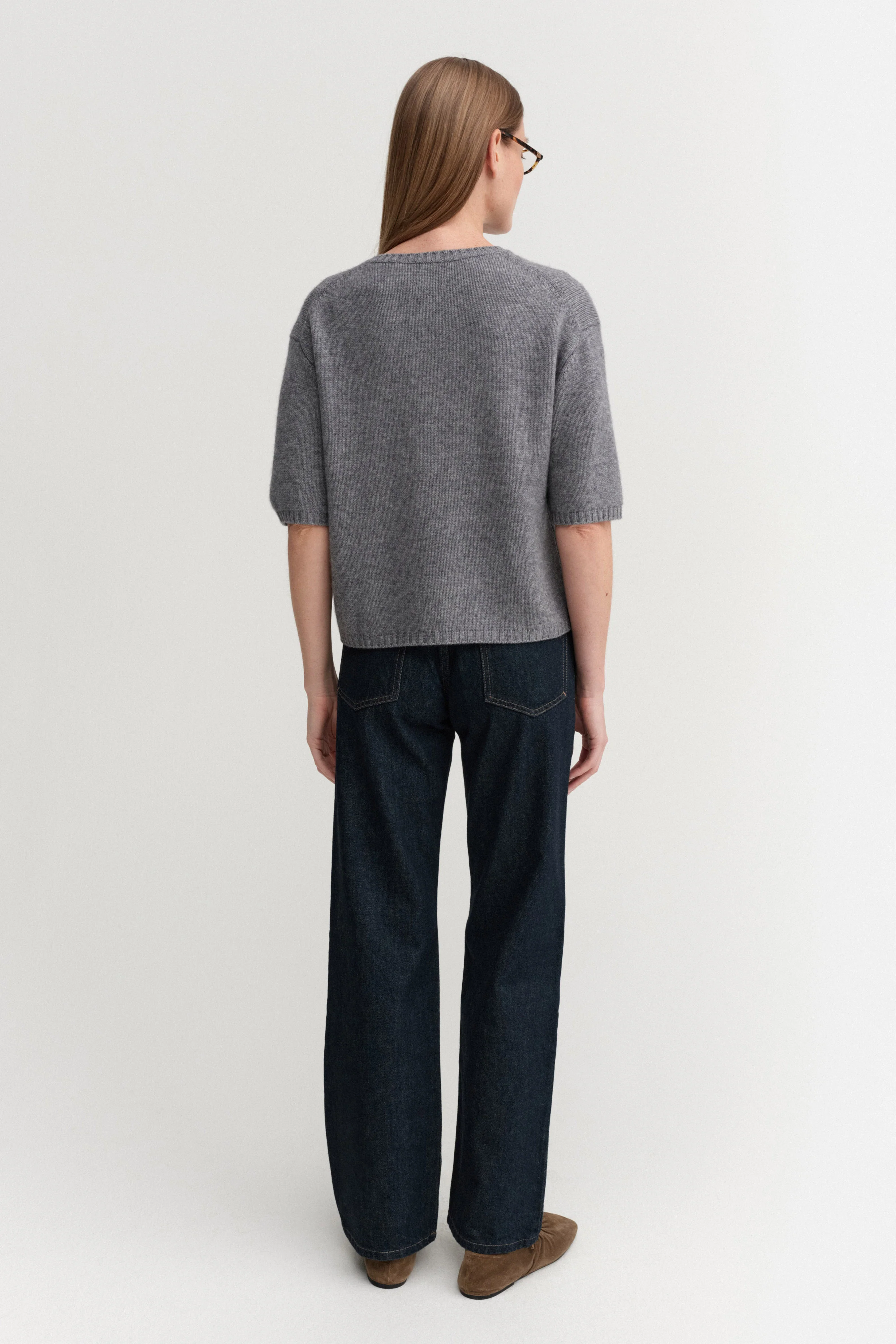 Fei Brushed T-shirt is knitted from super soft brushed cashmere with a hairy yet smooth finish. It is cut for an oversized boxy fit with a slightly cropped hem. Featured with dropped shoulders and completed with a ribbed neckline, cuffs and hem.