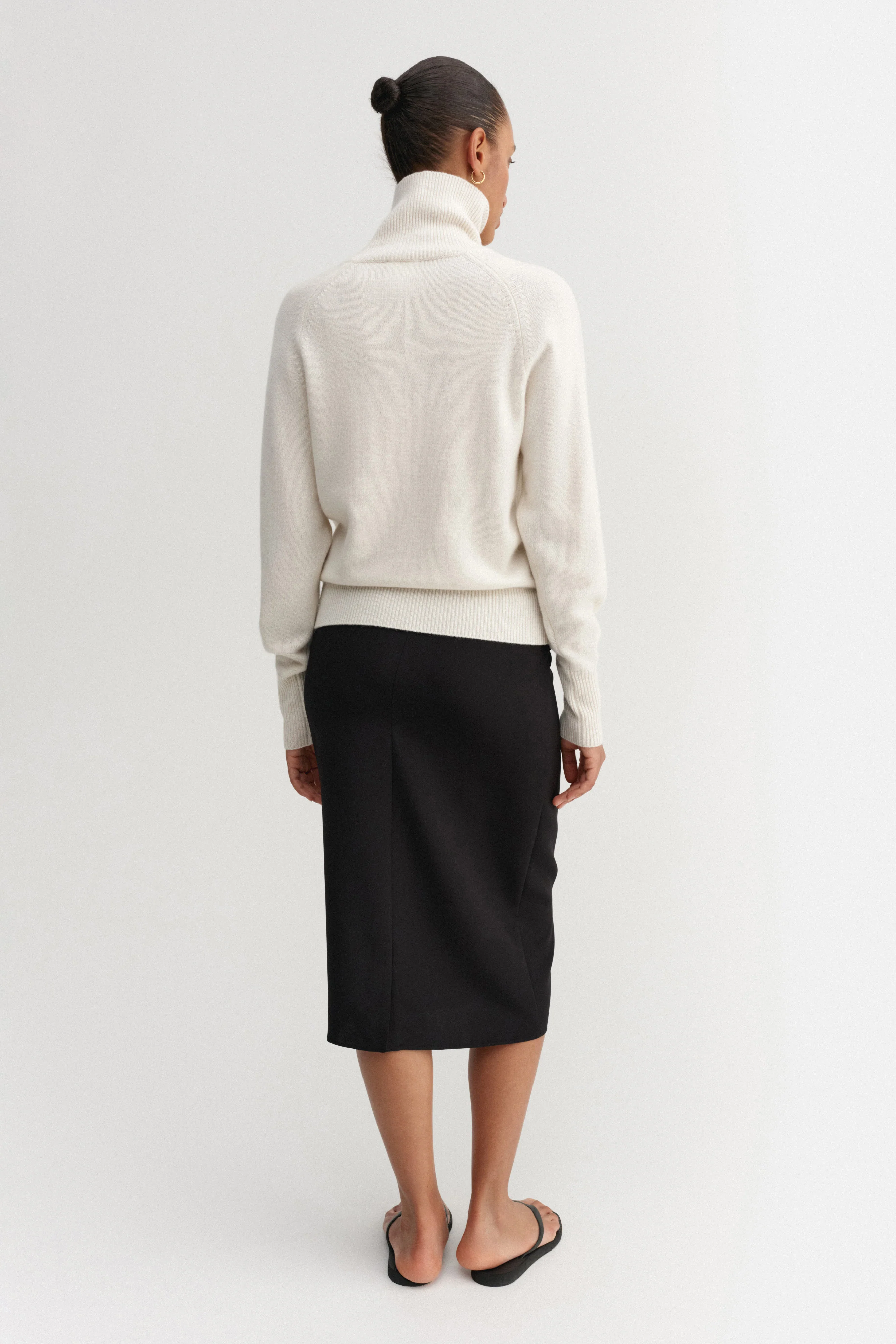 Gigi Turtleneck Sweater is knitted from super soft Mongolian cashmere, providing a smooth and itch-free feel against the skin. The sweater is designed for a slightly loose fit with a silhouette that sits tighter on the waist and end of the sleeves for easy roll up. It is featured with a high turtleneck, raglan sleeves and finely rib-knitted detailing in collar, cuffs and hem.